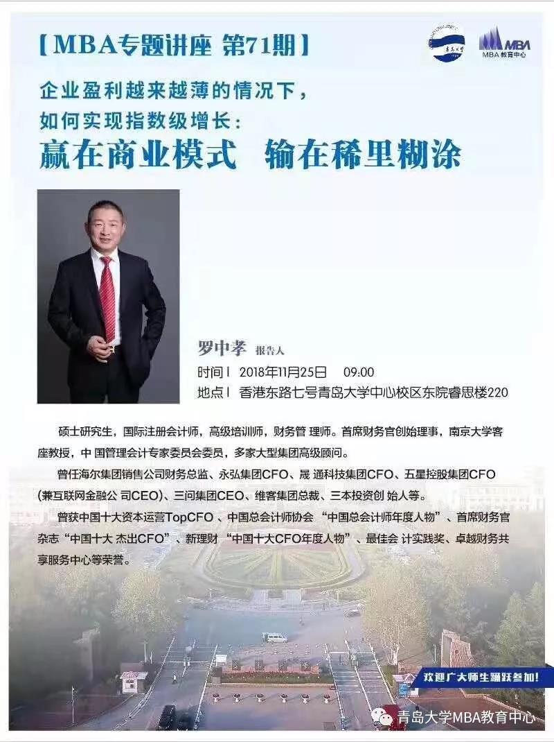 2018年11月25日9:00,在青岛大学东院睿思楼,青岛大学MBA校友、现三本投资创始人罗中孝老师为2018级MBA学员讲述了《赢在商业模式 输在稀里糊涂》专题讲座。